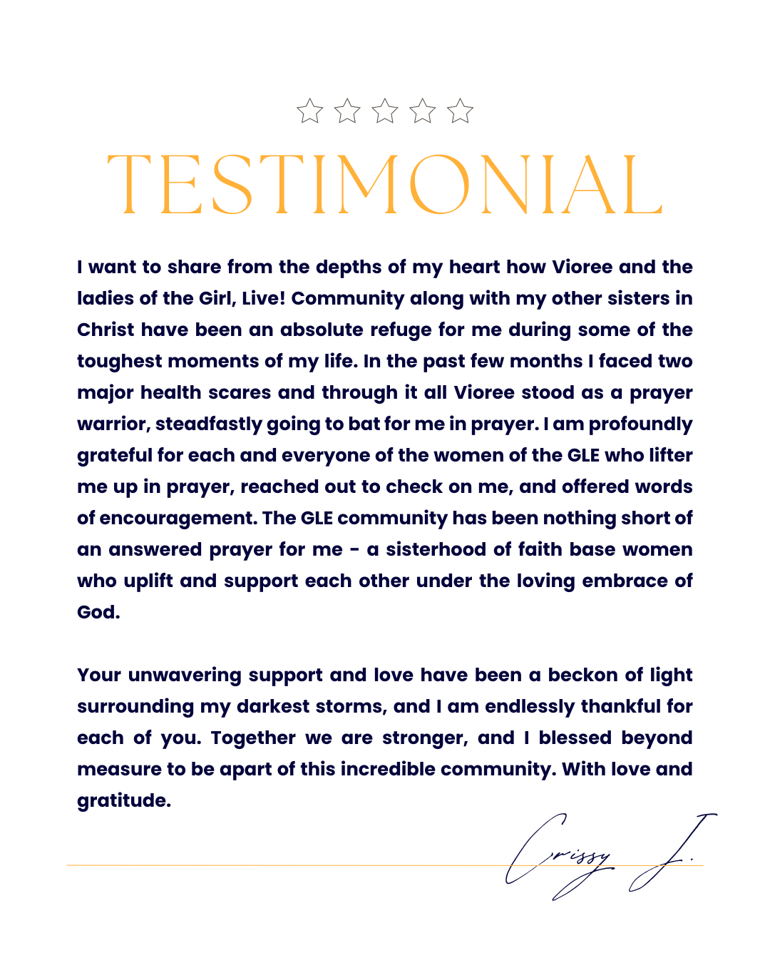 The Girl, Live! is a transformative movement focused on empowering women to embrace their authentic selves and lead lives filled with meaning and fulfillment. At its heart, the community encourages women to prioritize SELF-AWARENESS, comprehend their IDENTITY IN CHRIST, and implement STRATEGIES FOR PROGRESS IN LIFE, BUSINESS, MARRIAGE, and MINISTRY, ensuring that their actions and choices resonate with their core values and beliefs. By nurturing a sense of purpose, The Girl, Live! inspires women to chase their dreams and aspirations with unwavering determination and resilience, overcoming societal barriers that may have previously impeded their progress.