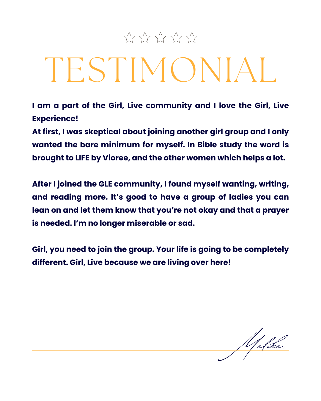 Ultimately, The Girl, Live! aims to create a world where women are free to express their individuality, pursue their passions, and make a meaningful impact, ensuring that every woman's voice is valued and celebrated. Through this movement, women are encouraged to embrace their best lives, paving the way for a brighter and more inclusive future for everyone.